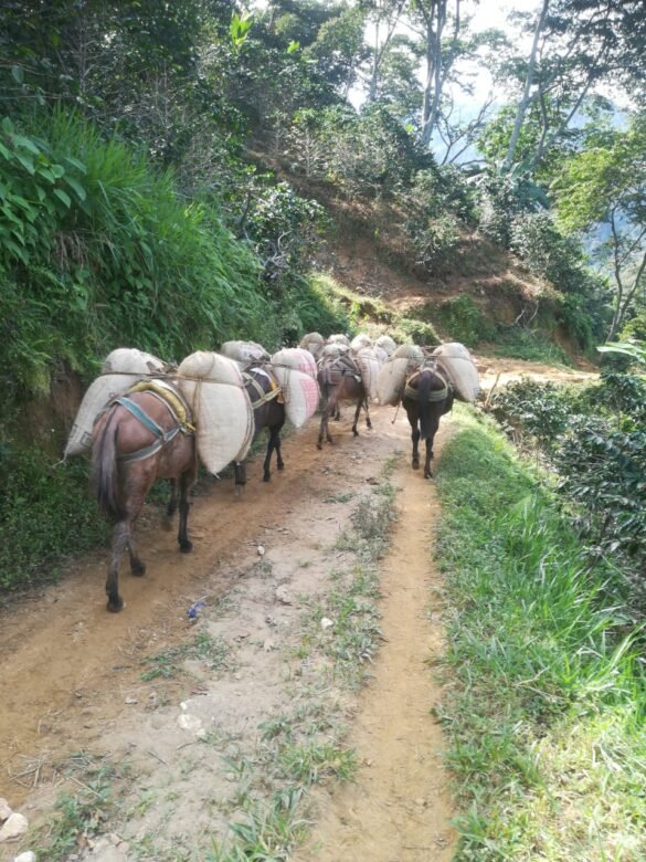 El café, que cultiva Fredy Cala a 1.200 metros sobre el nivel del mar en la Sierra Nevada de Santa Marta, es cargado en sacos de fique a lomo de mulas por los caminos en medio del fango.